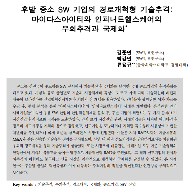 - 논문 제목: 후발 중소 SW 기업의 경로개척형 기술추격: 마이다스아이티와 인피니트헬스케어의 우회추격과 국제화